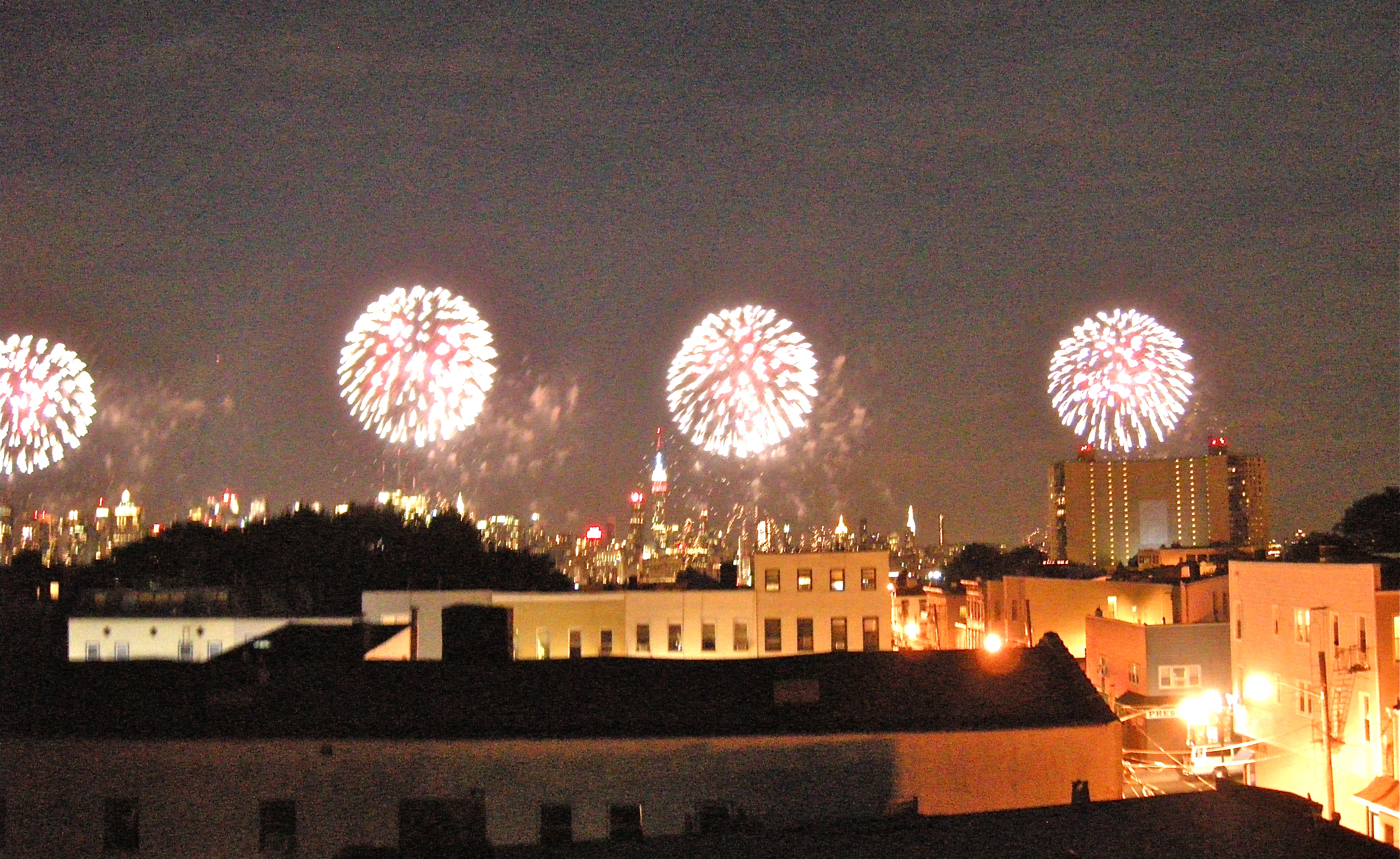 A spectacular fireworks display over the Hudson River tonight, against the New York City skyline. (You can see the Empire State Building peeking through the night sky in red,white and blue) We went out on the roof of our building here in Union City to watch it. One of the benefits of our location.