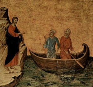 The Italian artist, Duccio, paints an interesting picture of today’s gospel passage of the call of the disciples, Peter and Andrew. Jesus stands on the shore calling the two brothers to come from their boat and follow him. The two brothers have their hands firmly on their fishing nets, looking a little warily at the one who’s calling them. After all, they’re got their livelihood to think about, families to support, and probably a thriving business that’s never been better.