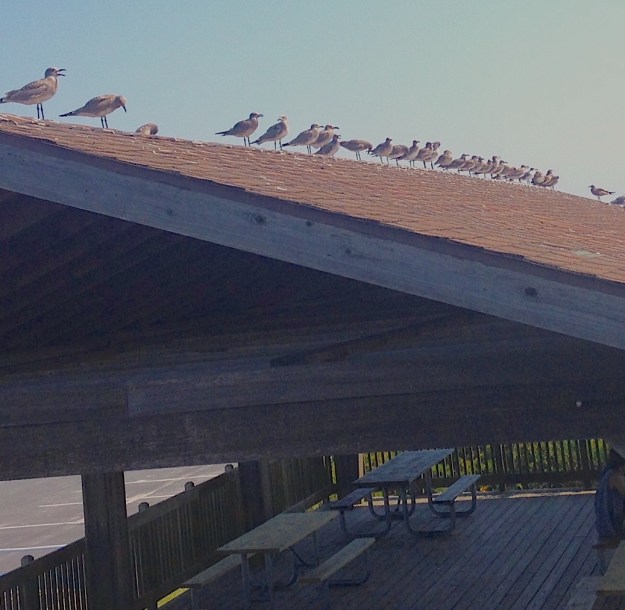 I went fishing but caught no fish. I went bird-watching at a good spot off the beach, but saw few local or migrating birds –except for the line of gulls perched on a shelter roof looking out to the sea. (Above)