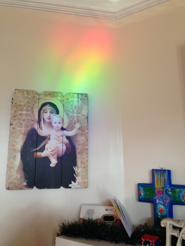 In our home we put up this image of Mary and Jesus across from our front door. Over the door there is a window that lets in the low, December sun from the front porch. This Christmas season, on the porch light we set up a big, transparent plastic star, that we light up at night. But in the morning, as the sun’s rays are refracted by the star and enter through the window this wonderful effect is created over the picture of the Mother and Child. People have told us that it is “miraculous”, “ a sign”, “ a gift from God”. It has certainly filled me with delight and gratitude. I took it as an “omen” that this would be the best Christmas ever. It wasn’t quite so.