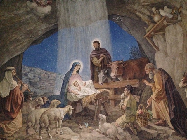 Grottoes can be visited, where the ancient shepherds once kept their animals, and where artifacts from the 1st Century have been found, In these grottoes Franciscan priests celebrate the Mass with pilgrims all day long. One place that caught my attention and devotion was the “Chapel of the Angels”, designed by Antonio Barluzzi in the early 1950’s. It has a strange dodecagonal ( twelve-sided)shape, with a steep dome, supposed to resemble a shepherd’s tent. Inside it is graceful, peaceful, and filled with light from the many star-like openings in the dome. There are three semicircular chapels, each with a painted mural telling the story of the shepherds on Christmas morning. I have tried everywhere to find the name of the artist but I have not been able to. Our guide said that if we look carefully at the murals we can see the different reactions that persons of different ages can have in the presence of the Divine.