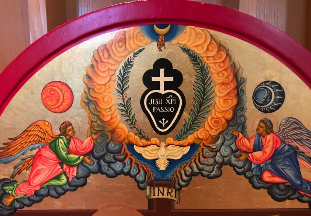 The top part of the icon shows the heavenly origins of our congregation. The hand of God the Father surrounded by his angels offers the Passionist Sign,  symbol of the community, to the world, signified by the sun and the moon. The Dove, the Holy Spirit, brings this gift into the world.