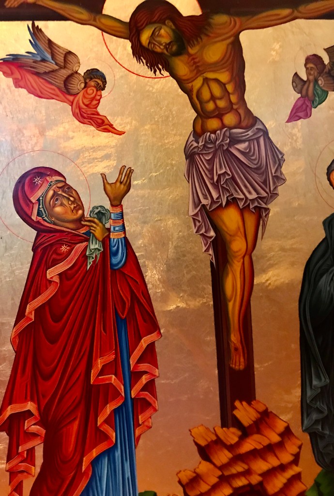 Mary, his mother, points to her Son. She’s the sorrowful mother, holding a cloth to her tearful face; two angels surrounding the Cross weep with her.