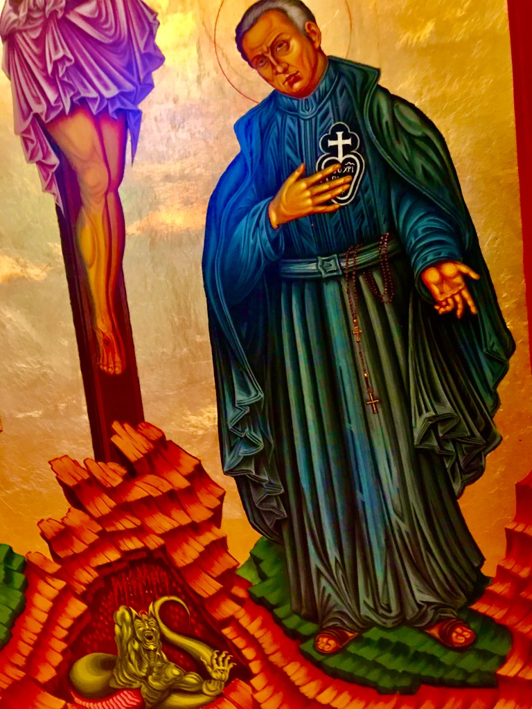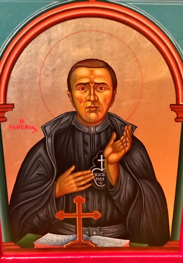 The side panels of our icon have portraits of Passionist saints and blesseds. St. Gabriel Possenti and Blessed Dominic Barberi on the right facing us, and St. Gemma Galgani and Blessed Isidore de Loor on the left. They follow Paul of the Cross in his mission.