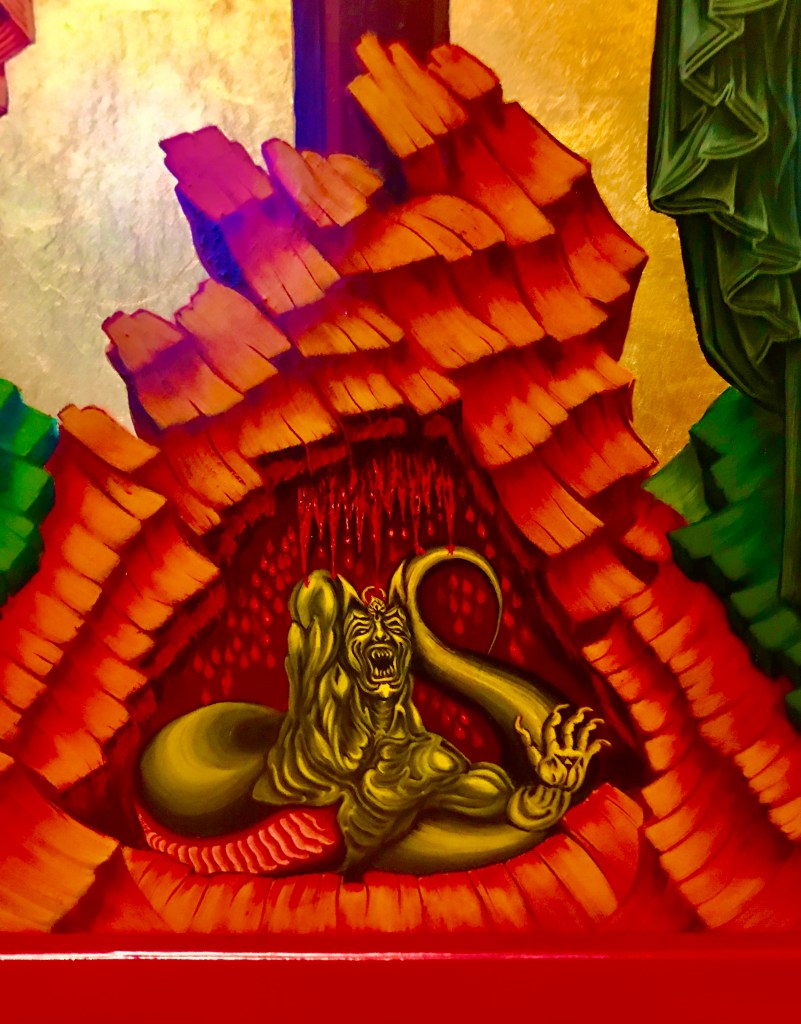 The Cross stands on a rocky cave containing a coiled monster in yellowish green. Artists sometimes place the bones of Adam and Eve beneath the Cross, which brings them new life, but here the artist has a symbol of evil that must be defeated.