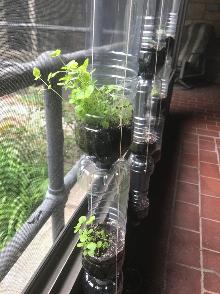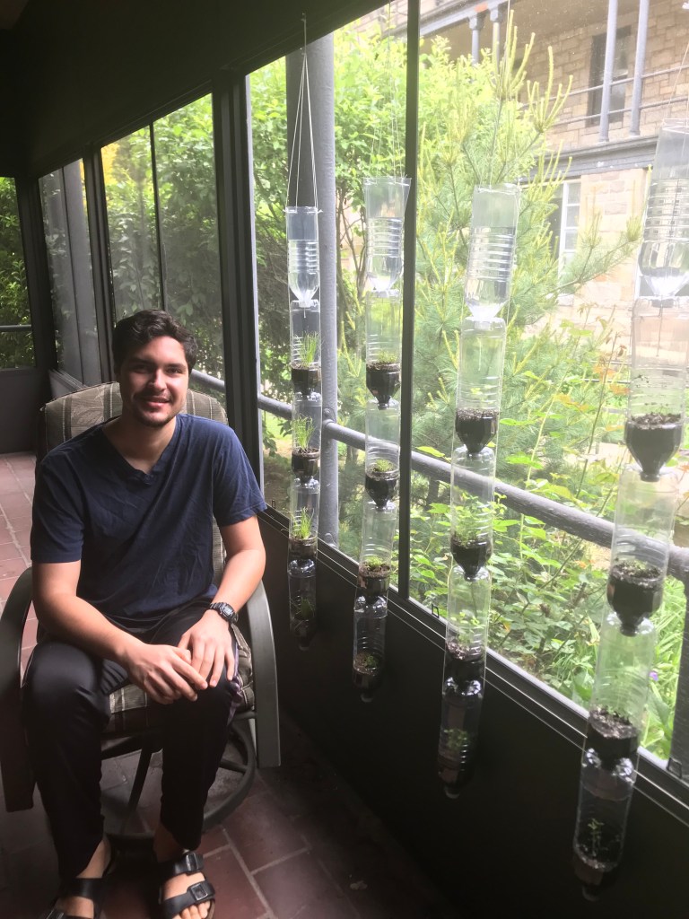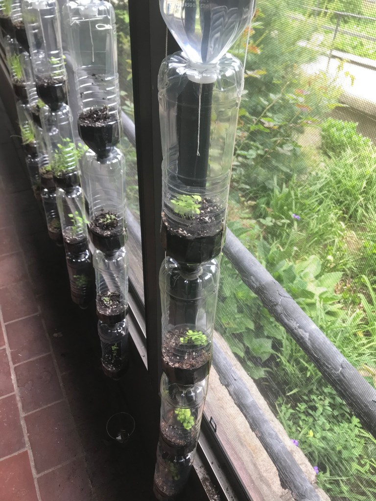 Jonathan Ramos is growing plants on our monastery porch these days In a collection of used plastic bottles, tied together ingeniously with string. Assorted herbs are fed by water dripping from bottle to bottle, plant to plant, supplying the nourishment they need.