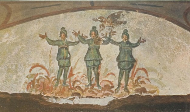 The three young men and their prayer in the fiery furnace was a story early Christians greatly admired. They frequently placed the representation of the three young men in the catacombs as a reminder that God hears us in the fiery furnace, whether it’s the fiery furnace of life or of death. God not only promise us life. God promise all creation resurrection and life.