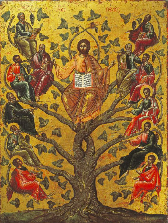 This icon, Christ the Vine, was painted by a famous fifteenth-century Cretan iconographer Angelos Akotantos (d.1450) before the Byzantine Empire collapsed, leading to the separation of Eastern and Western churches. The icon is a call for unity of the churches.