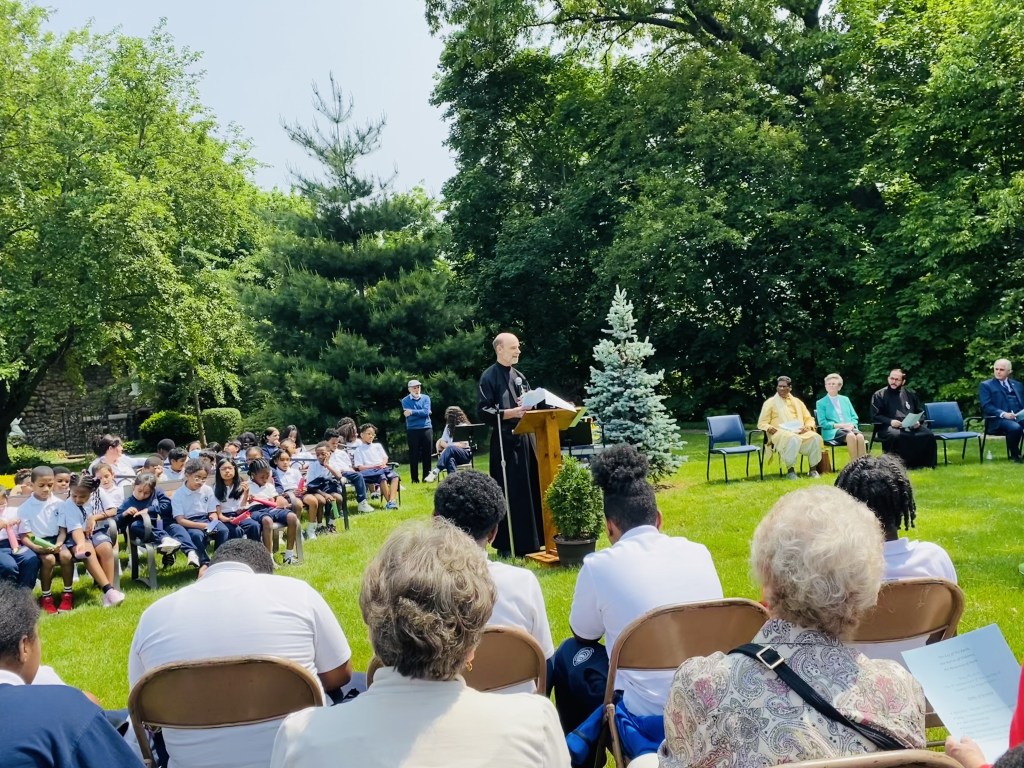 Today we marked the 8th anniversary of Laudato Si’ , Pope Francis’ major encyclical on the environment, by an ecumenical prayer service in our garden, where we blessed our new solar panels. Children from Immaculate Conception Academy sang and offered reflections on the “Cry of the Earth” . Faith Leaders, Fr. James O’Shea, Sr. Teresa Fitzpatrick, Pandit Yoganand Ramnarain, and Fr. Luis Daniel Guivas offered prayers. Our local Congressman James Gennaro was also present and commented on our garden’s privileged place in the geologic development of this area of New York City.