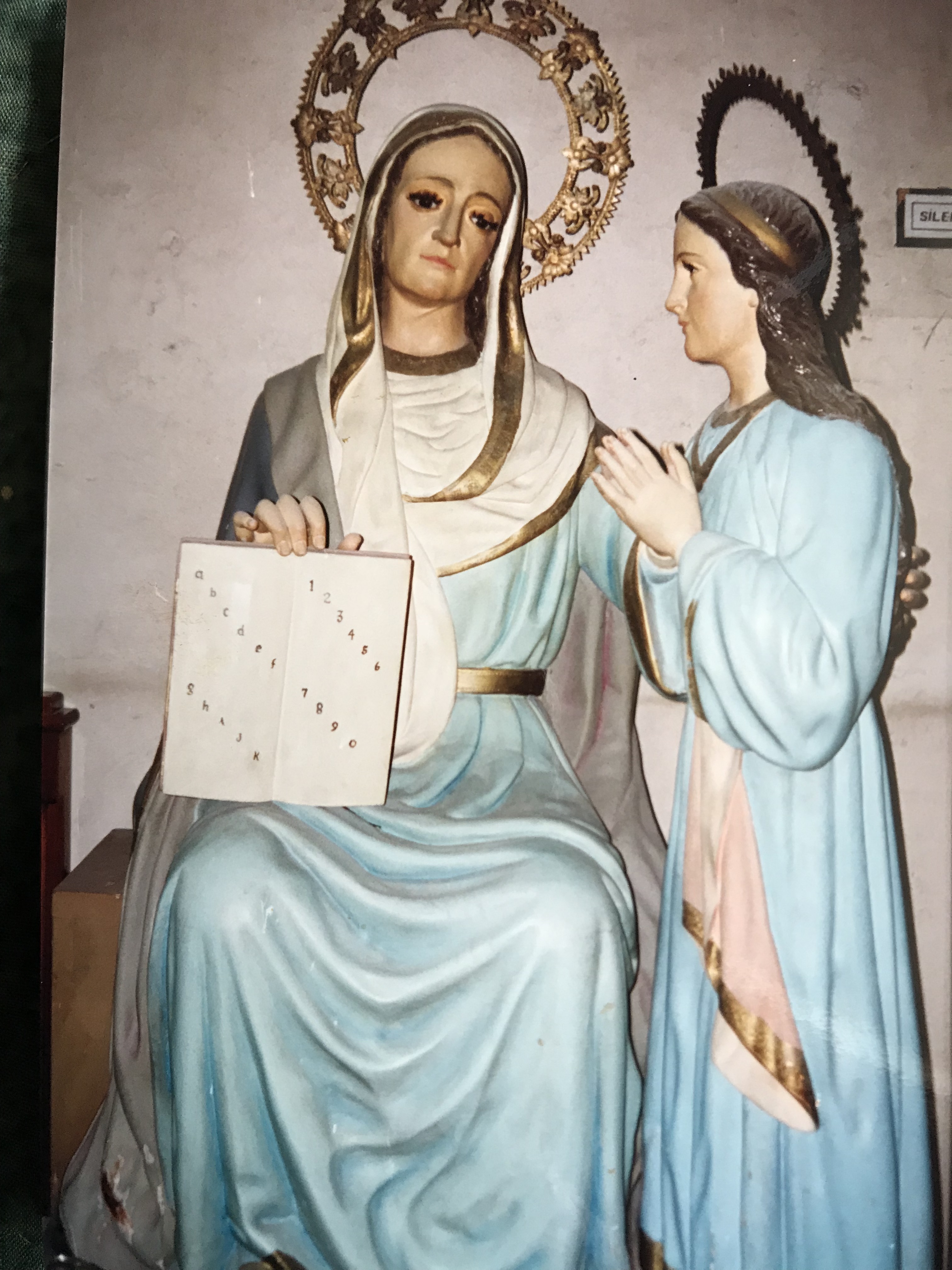 Years ago, in the ancient cathedral in Tegucigalpa, Honduras, I saw a large statue of St. Ann teaching her child Mary from a book. (Above) Usually statues like this show Ann teaching Mary how to read the Bible, but this was something different. Ann was pointing out 1,2,3,4 and A,B,C D– the numerals and the letters of the alphabet.