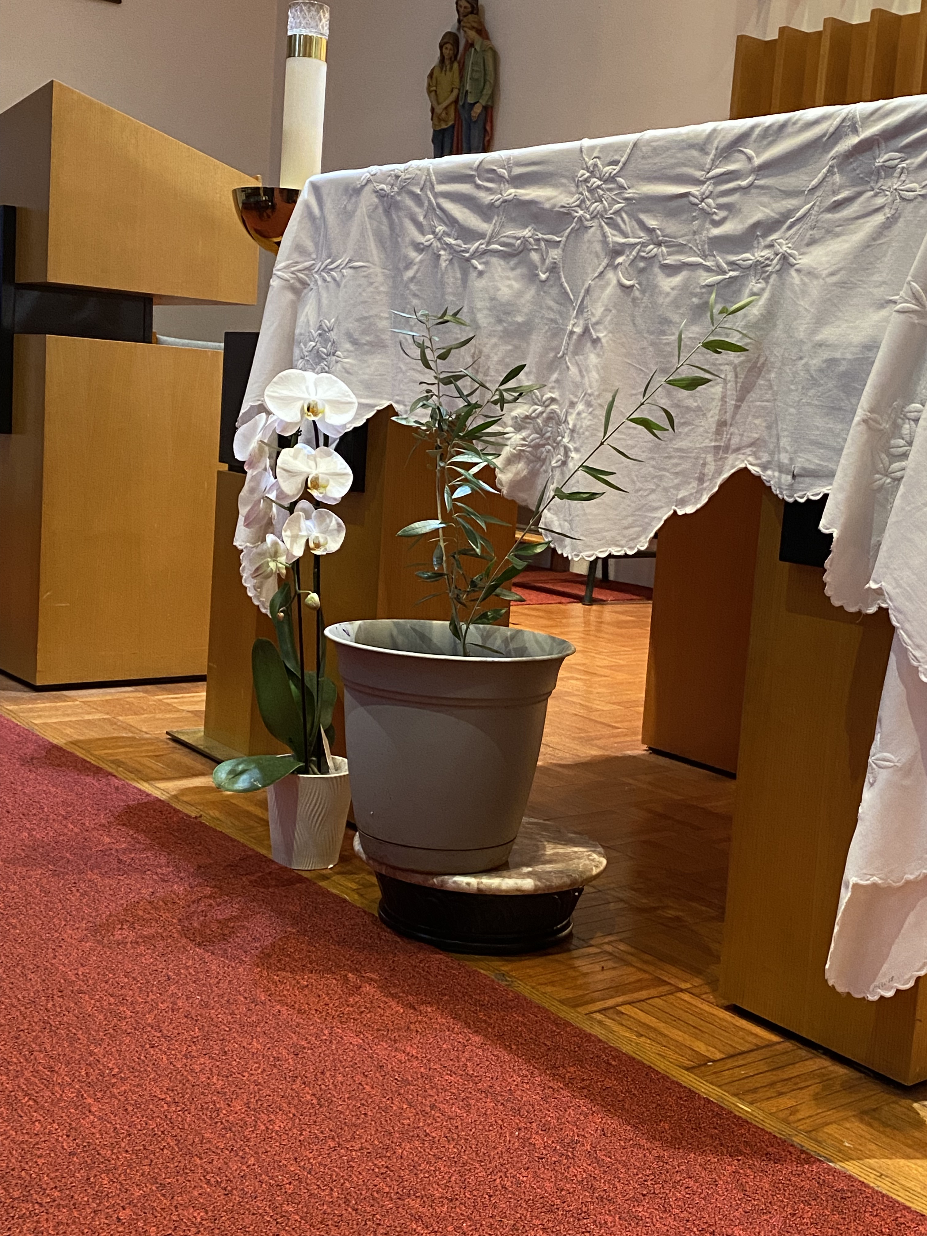 We have an olive tree before our altar today. Olive trees were highly prized in biblical times and centuries afterwards for oil that nourishes and heals. They bring life. For the ancients an abundance of olive trees was a sign of God’s blessing; their destruction or lack of fruitfulness was a test of faith.