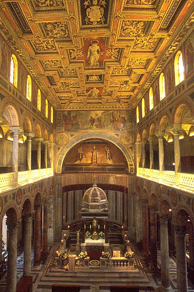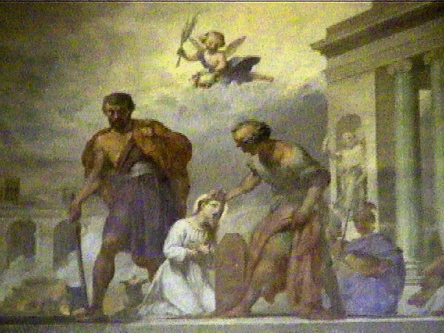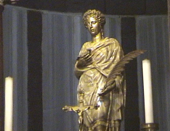 The story says they put Agnes among the prostitutes found near the racecourse then on the Piazza Navona in Rome. God warded off those who tried to rape her. A church in her honor stands today in the busy piazza; another church over her grave is on the Via Nomentana in Rome. (above)