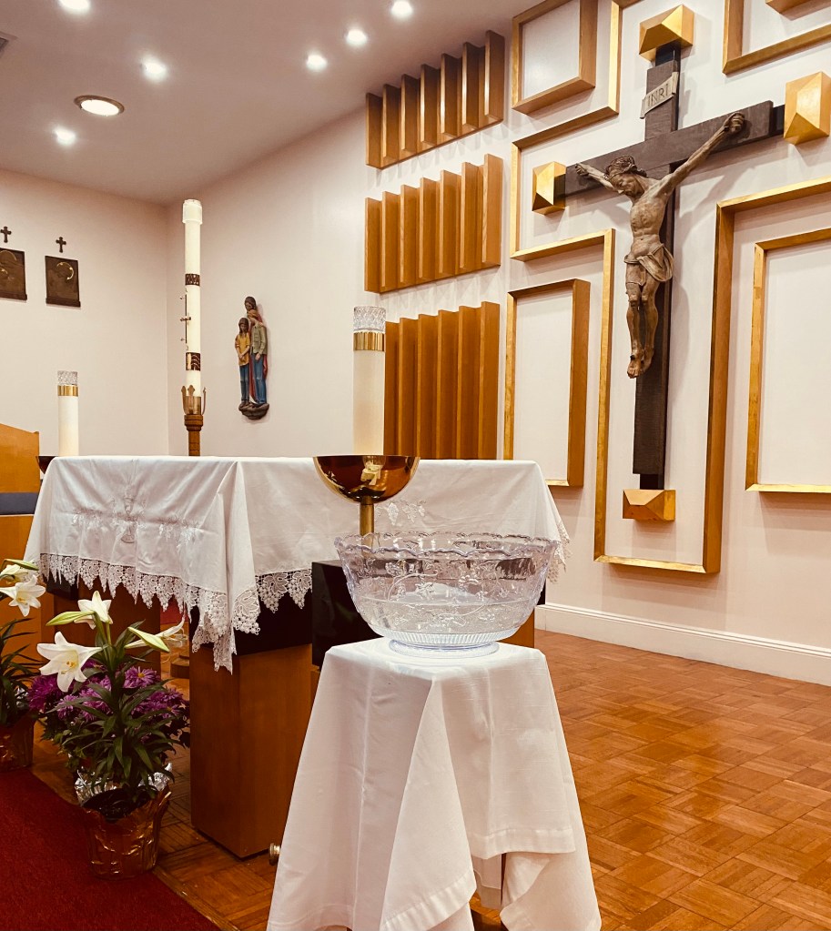 As he did with the two disciples on the way to Emmaus, Jesus walks with us and breaks bread with us. The Paschal Candle next to the scriptures are a sign his light never fails. The water blessed for baptism on the side of the altar reminds us we have been reborn of water and the Holy Spirit.