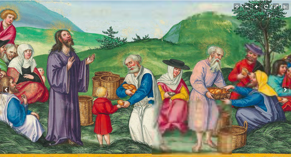 On a mountain Jesus teaches, then “wipes away the tears from all faces,” Matthew’s Gospel says. “Great crowds came to him, having with them the lame, the blind, the deformed, the mute, and many others. They placed them at his feet, and he cured them.” Then he feeds them all from 7 loaves of bread and a few fish.