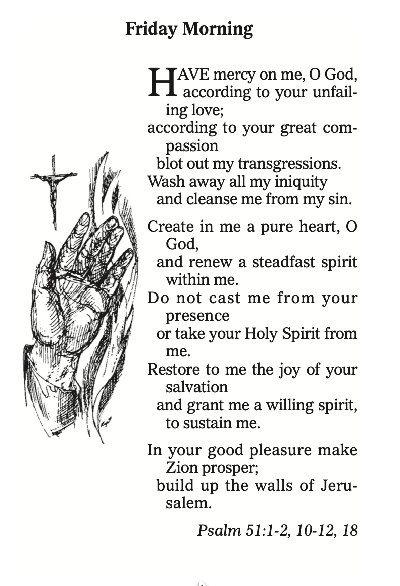 The cross in the illustration is a sign of God’s love for us. Psalm 51 is the original Act of Contrition. A beautiful prayer for Fridays and for all days.