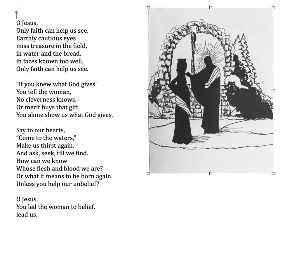 The Samaritan woman and Naaman the Syrian, two individuals we read about this third week of Lent. Aren’t they complicated people? Surely the woman with five husbands, who goes alone to Jacob’s well for water, who stands up to a Jewish man, is a complicated woman. She’s also a powerful voice in her world, as she persuades the people of her town to come and see a Prophet who promises living water.