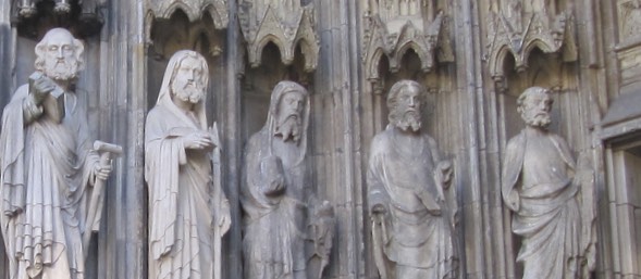 The apostles stand at the western door of the Cologne Cathedral. Peter and Paul are nearest the door itself. Above them is the scene of their martyrdom under Nero. They’ve given their lives to the truth that’s told here, that Jesus Christ, the Son of God, was sent from above, and by his death and resurrection he calls us to follow him to glory. They’re teachers of faith who invite us to believe. You might call this door a version of the Apostles’ Creed.