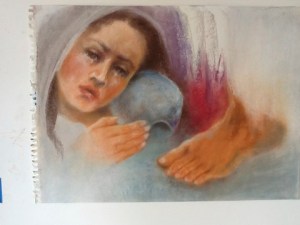 An artist friend of mine painted this picture of Mary anointing Jesus. How fitting that Holy Week begins with this gospel when we’re called to follow Mary and kneel and pour out the oil of our love on him whose life was poured out for us.