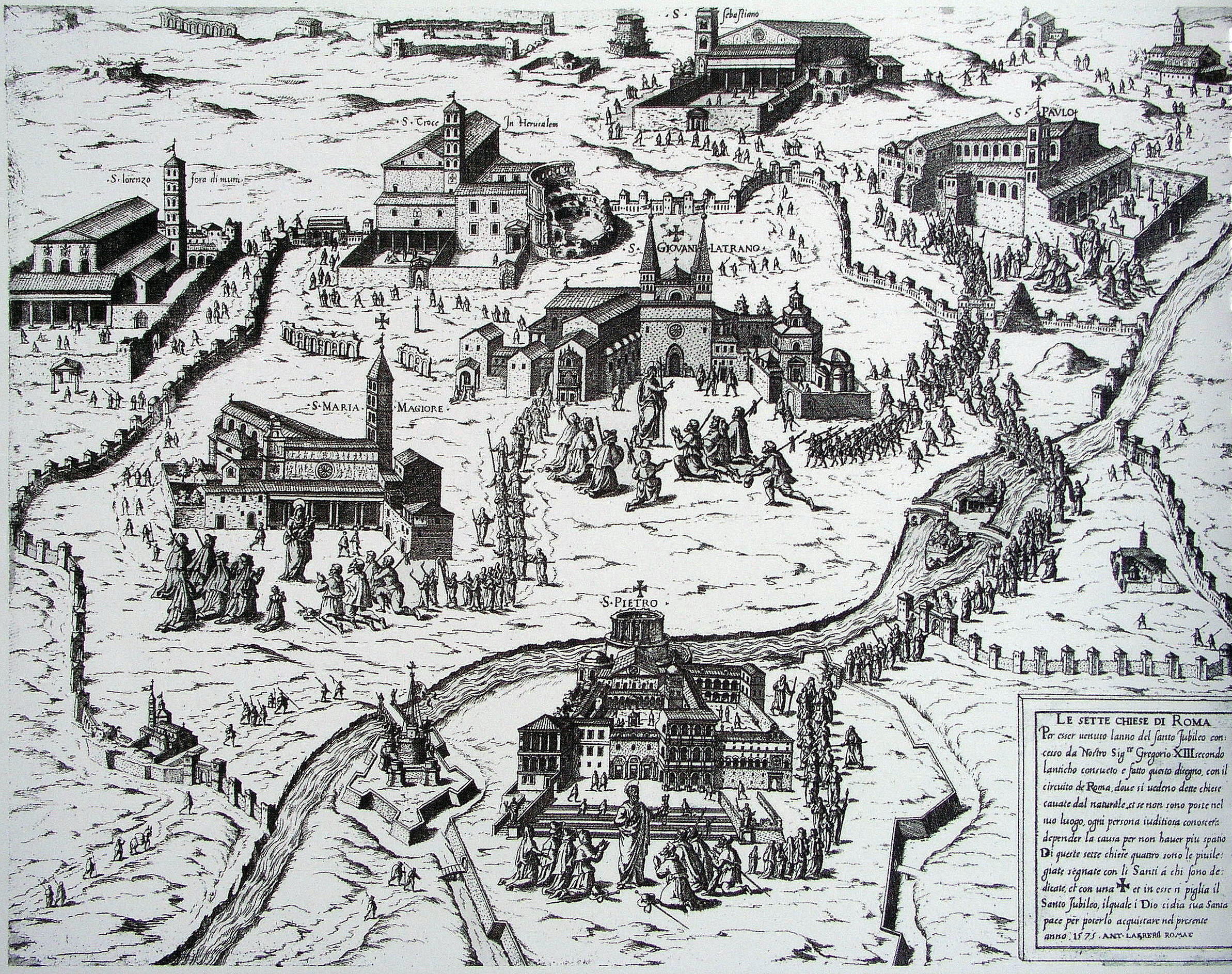 From earliest times pilgrims followed a path from one church to the other, visiting a number of other Christian shrines – St. Agnes and St. Lawrence, for example–on their way. A later pilgrim map based on that ancient pilgrimage journey offers an example.