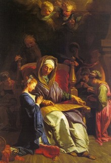 One picture from this era, still popular today, portrays St. Ann teaching her little daughter how to read. Sometimes the words on the book are words of scripture; sometimes they’re basic numbers or letters of the alphabet: 1,2,3,4-A,B,C.