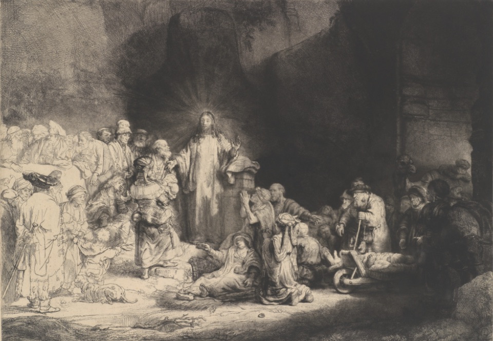Certainly, this is no quick study of a gospel story. Obviously, Rembrandt has thought about the Word who made our universe and humbled himself to redeem us. Perhaps he’s also thinking of the way Catholics and Protestants at the time were clashing among themselves, their picture of Jesus a strong, vigorous warrior. But here he stands humbly outside a little Dutch village that the artist’s contemporaries might recognize. Some of them may be pictured looking on at the two.