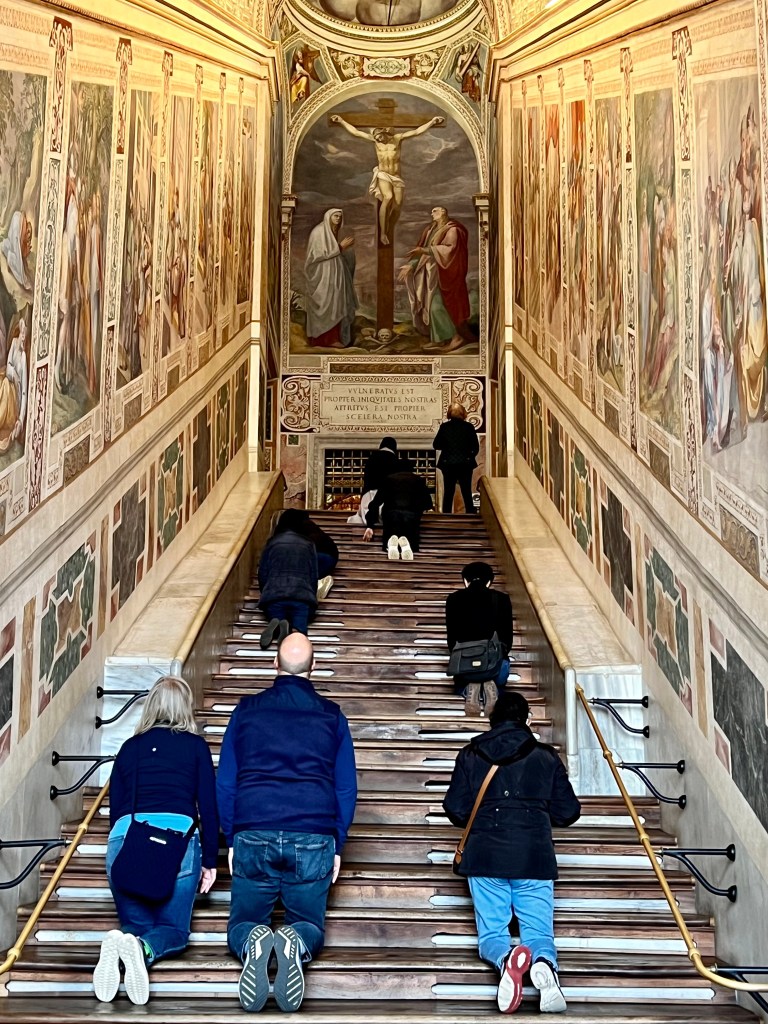 The chapel was rebuilt in magnificent style by Pope Nicholas III in the 13th century. Pope Sixtus V demolished most of the papal buildings in the 16th century but left the chapel alone in a free standing building, reached by a staircase of 28 steps. He claimed the stairs were from Pilate’s palace in Jerusalem on which Jesus walked to be judged. Historians and archeologists today say the stairs may be the stairs from the pope’s residence built by Constantine.